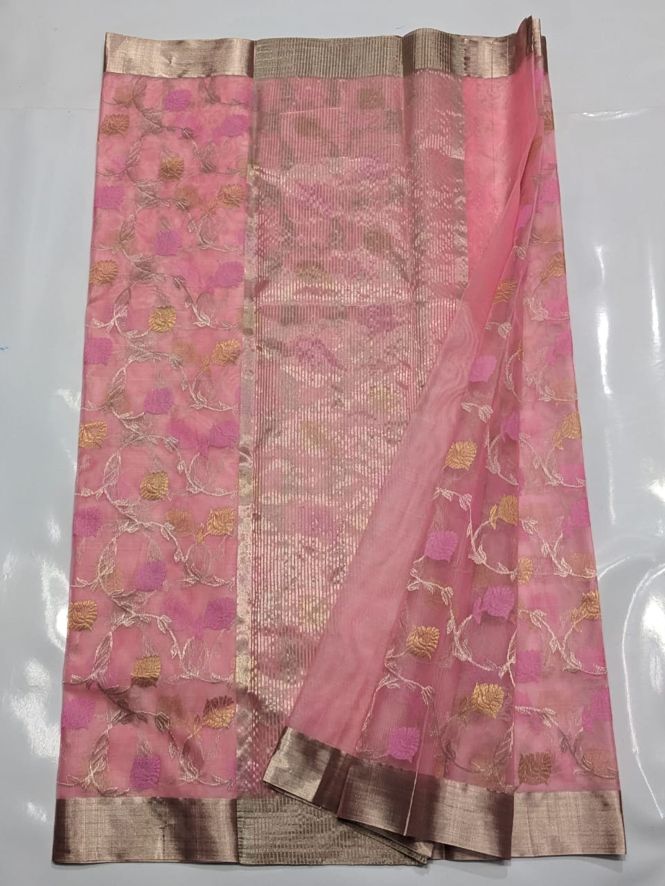 Coral Pink Chanderi handloom Katan Silk Meenakari Saree