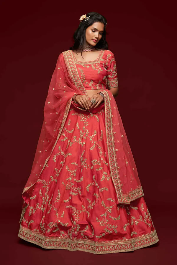 Bean Red Silk Lehenga with Thread, Zari & Sequins Work