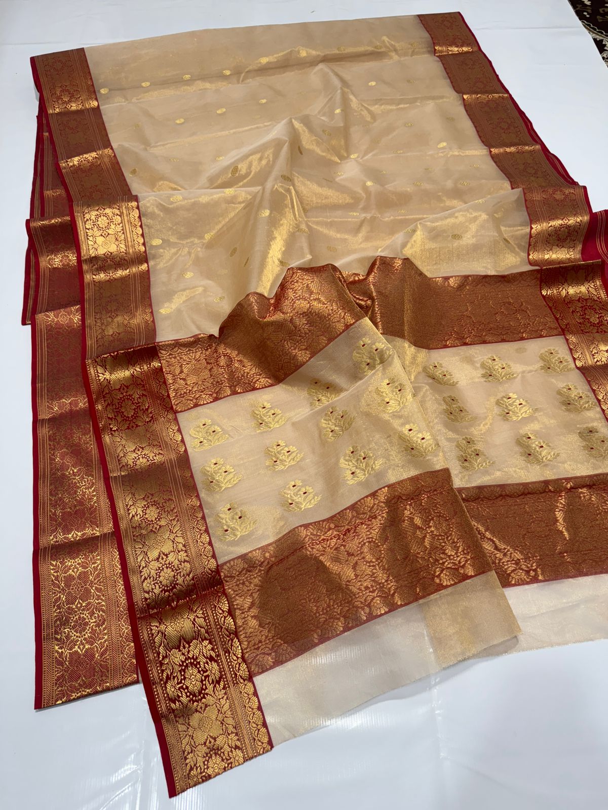 Beige Chanderi Handloom Katan Tissue Silk Meenakari Saree
