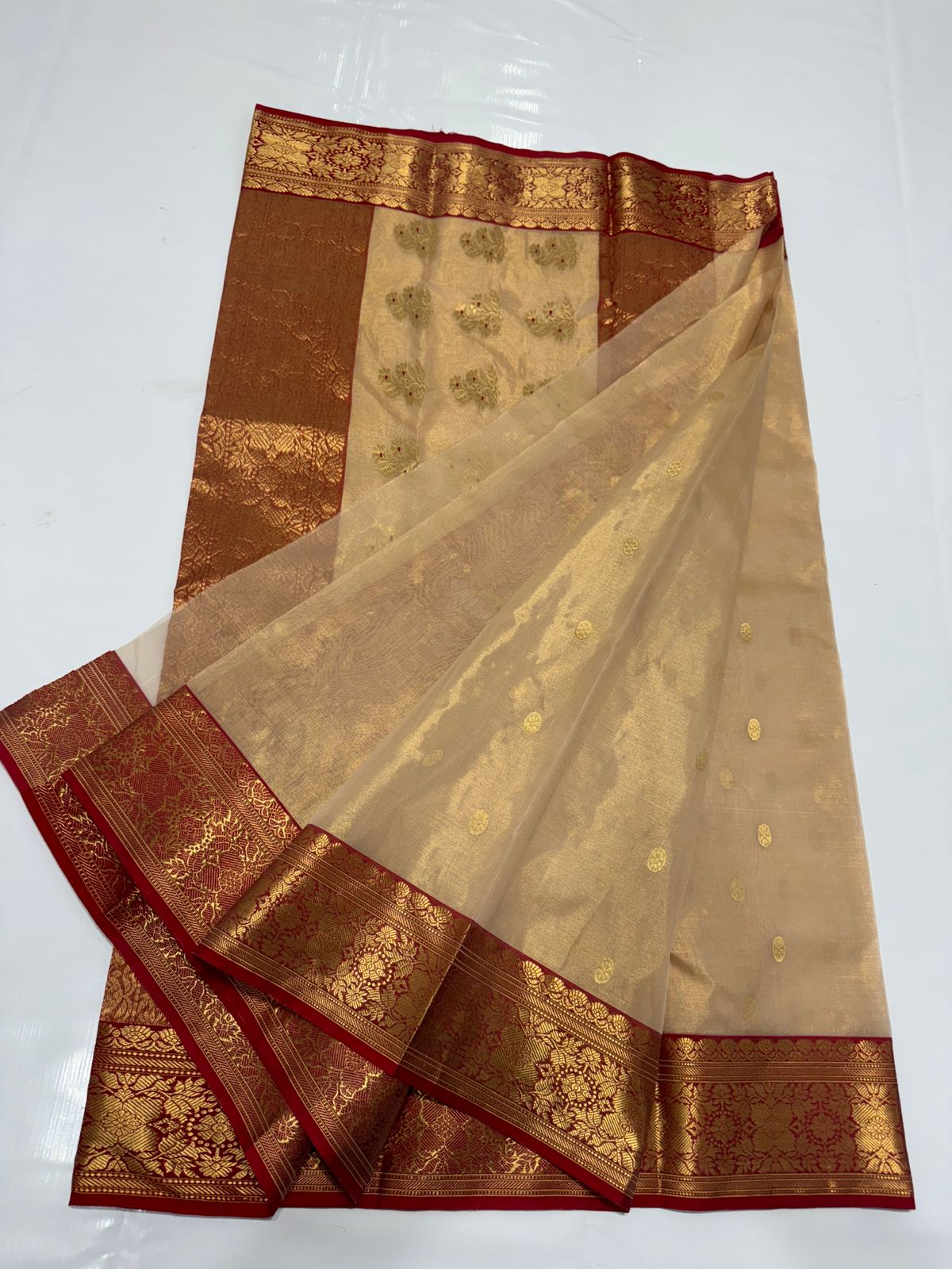 Beige Chanderi Handloom Katan Tissue Silk Saree