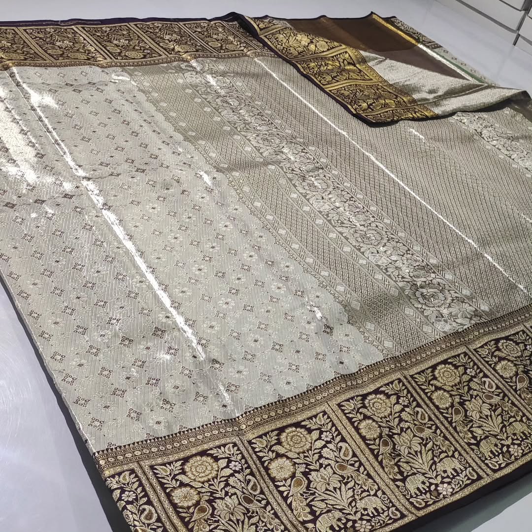 Ivory Kanchipuram Handloom Tissue Brocade Meenakari Silk Saree