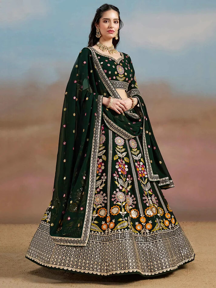 Dark Green Georgette Lehenga, Zari Embroidered Lehenga, Dori Work Lehenga Choli, Sequins Embroidery Lehenga, lehenga, Party Lehenga