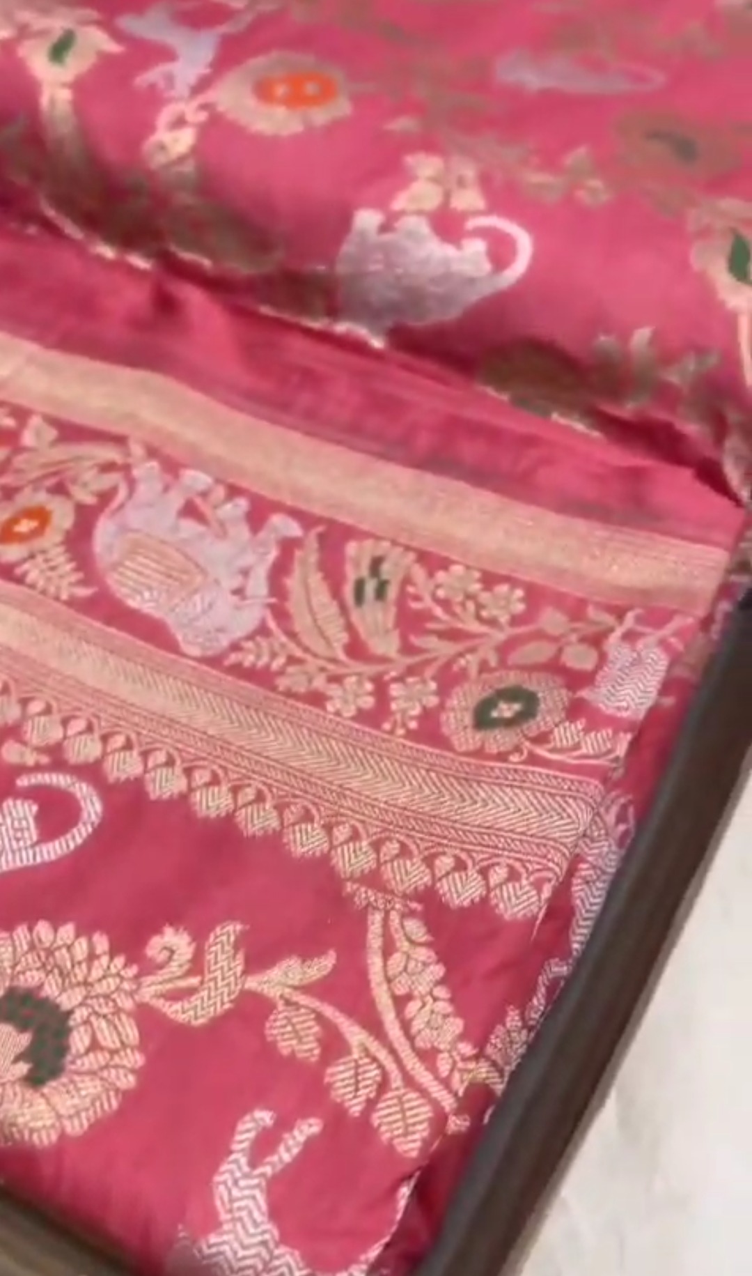 Deep Pink Banarasi Handloom Katan Silk Shikargah Meenakari Saree