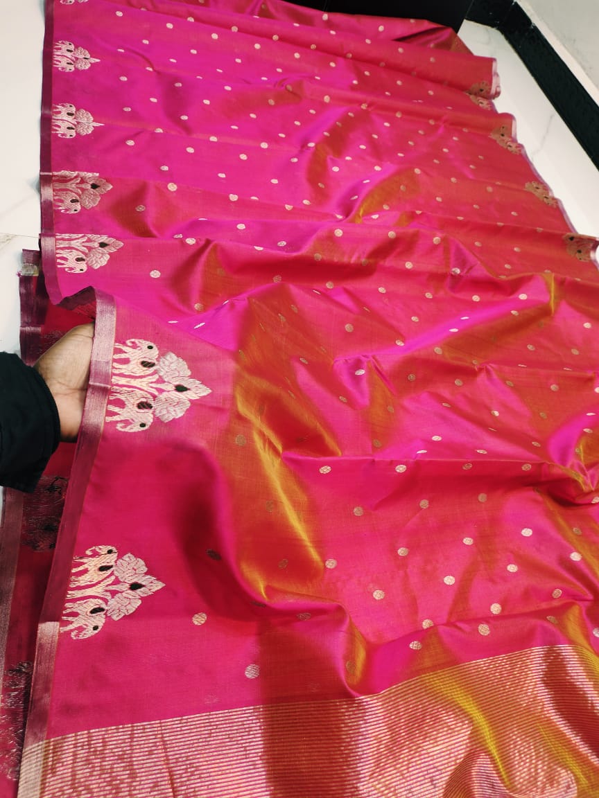Hot Pink Chanderi Handloom Pattu Silk Meenakari Saree