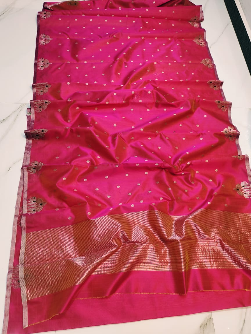 Hot Pink Chanderi Handloom Pattu Silk Eknal Buttas Saree