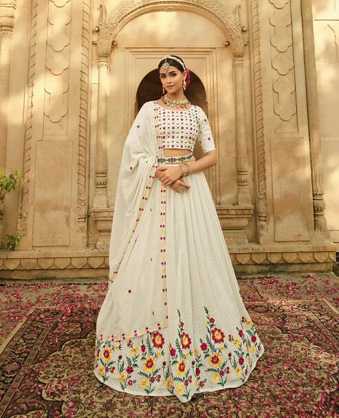 dusty white lehenga choli, georgette embroidered lehenga, thread sequins lehenga, designer white lehenga, festive wear lehenga, wedding lehenga choli, party wear lehenga