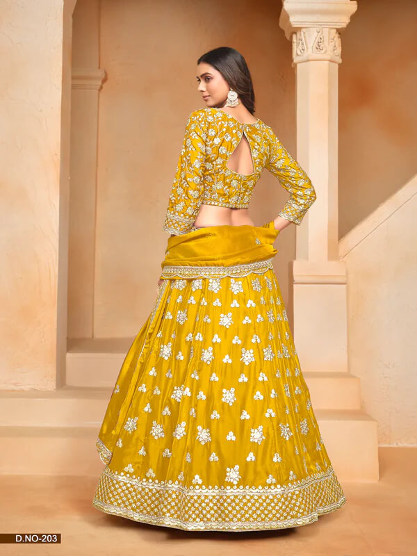 yellow organza lehenga, embroidered yellow lehenga choli, designer organza lehenga, festive yellow lehenga, party wear yellow lehenga, wedding yellow organza lehenga, thread & sequins embroidery lehenga