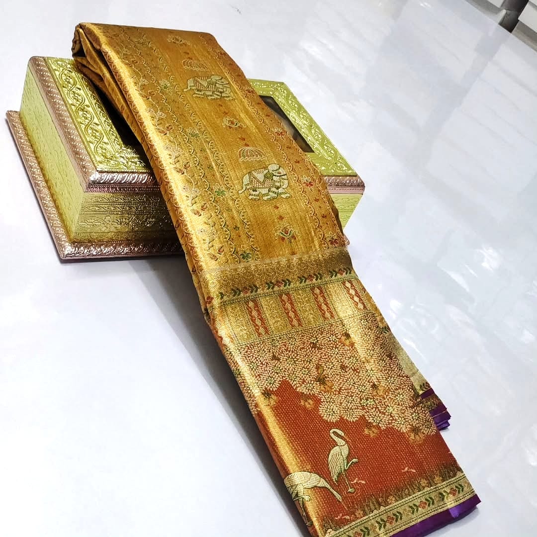 Golden Yellow Kanchipuram Handloom Tissue Brocade 1G Gold Bridal Saree