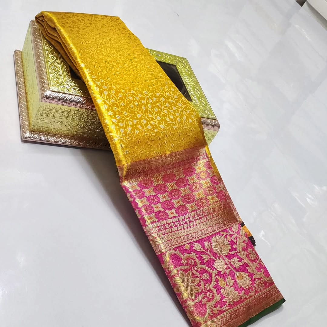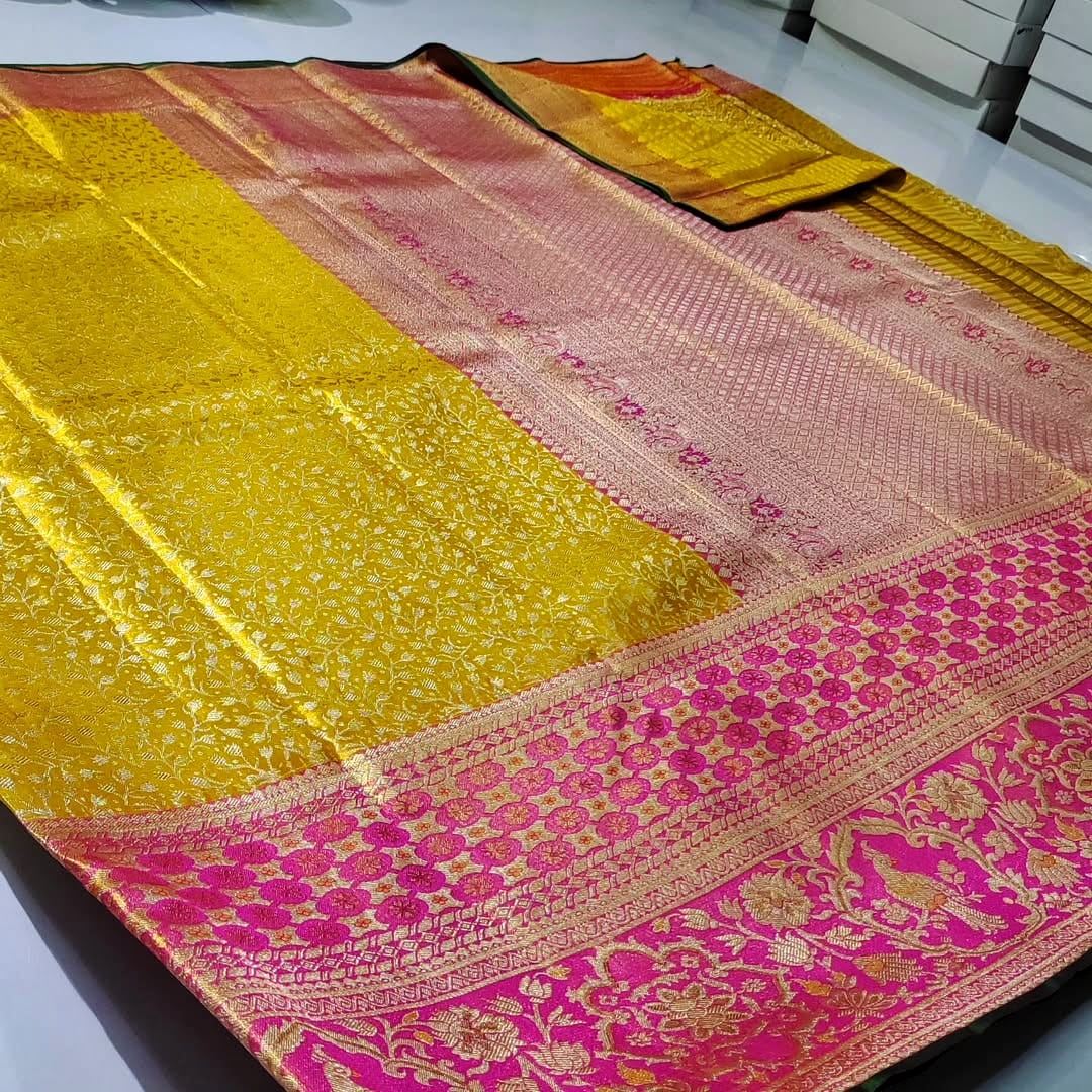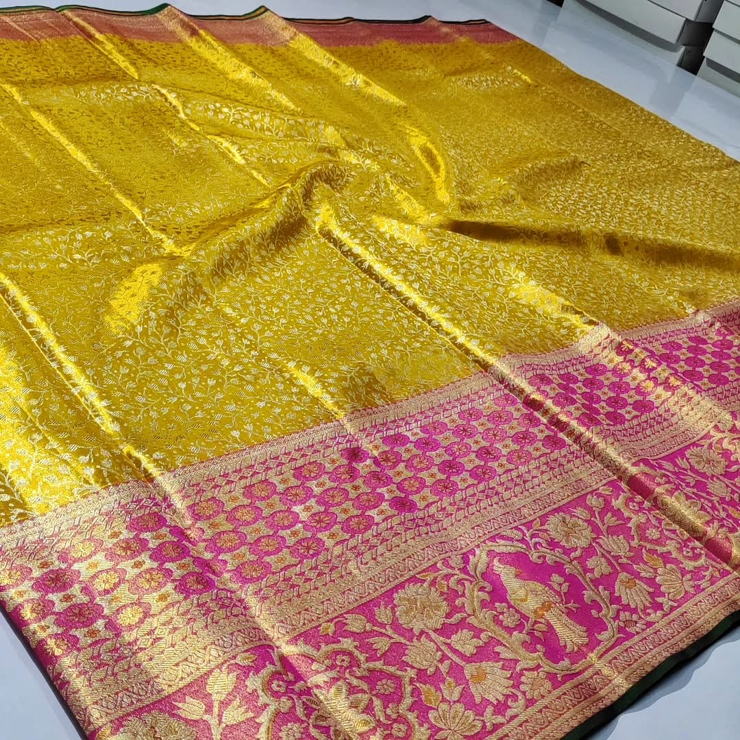 Yellow Kanchipuram Handloom Tissue Brocade Meenakari Silk Saree