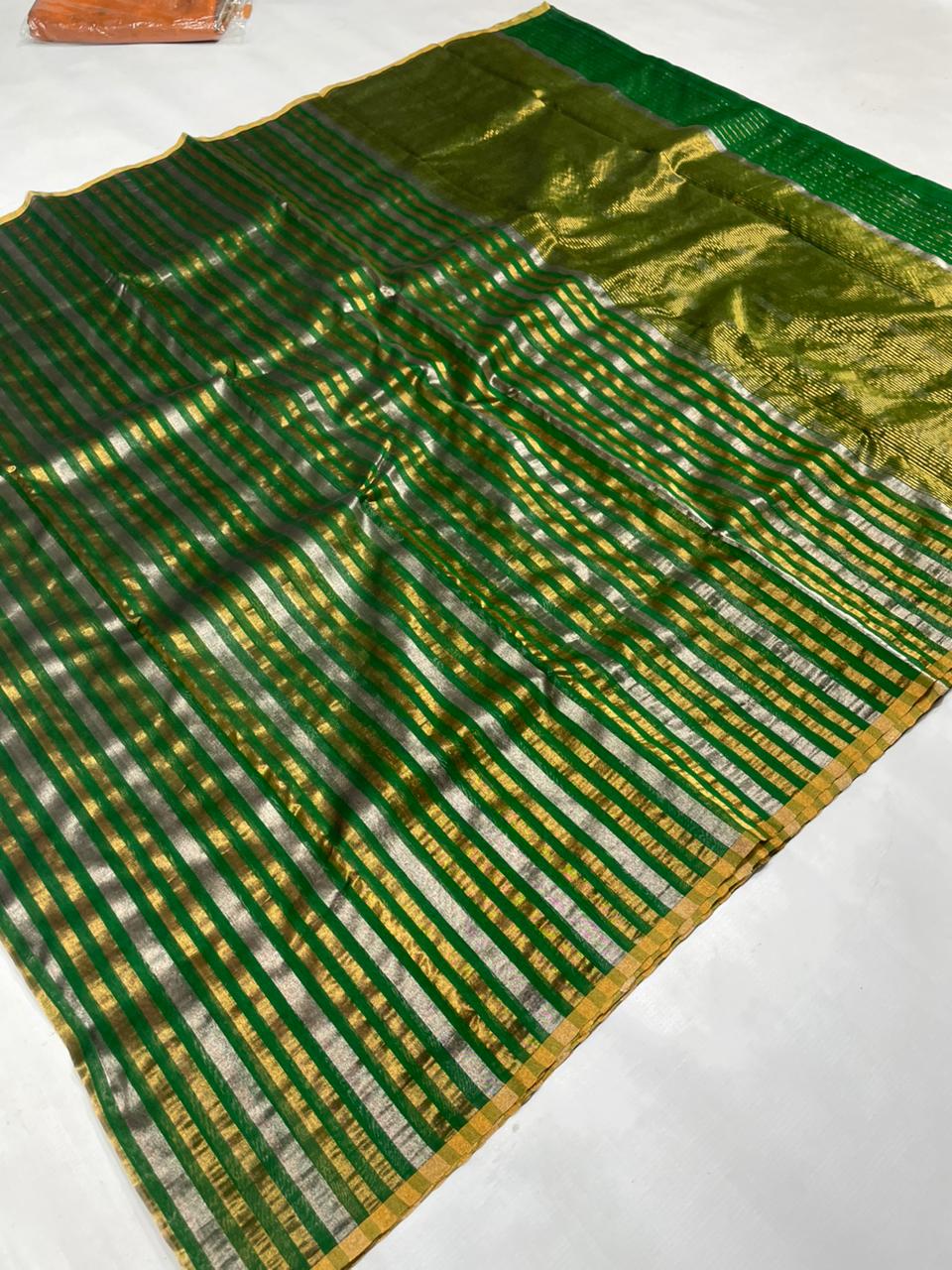 Pastel Lime Green Chanderi Handloom Cotton Silk Striped Saree