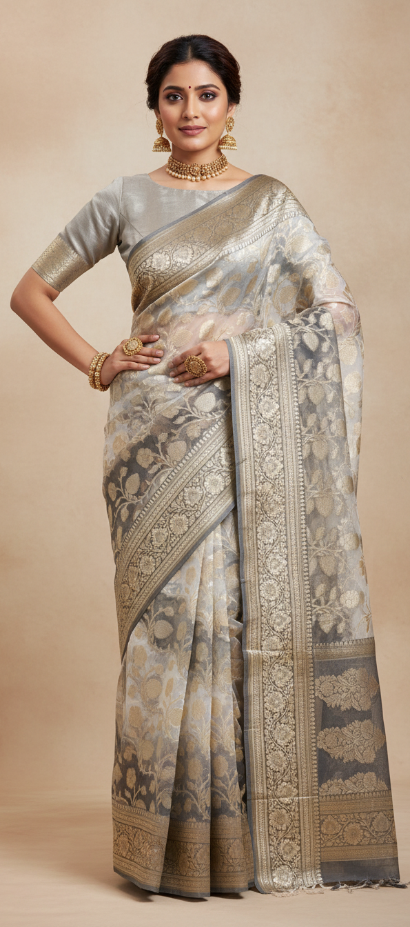 Grey Banarasi Handloom Rangkat Kora Tissue Silk Saree