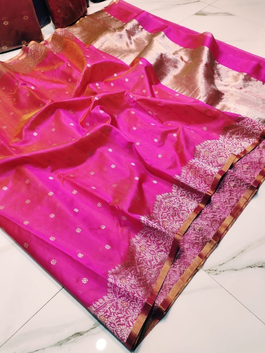 Hot Pink Chanderi Handloom Pattu Silk Eknal Buttas Saree