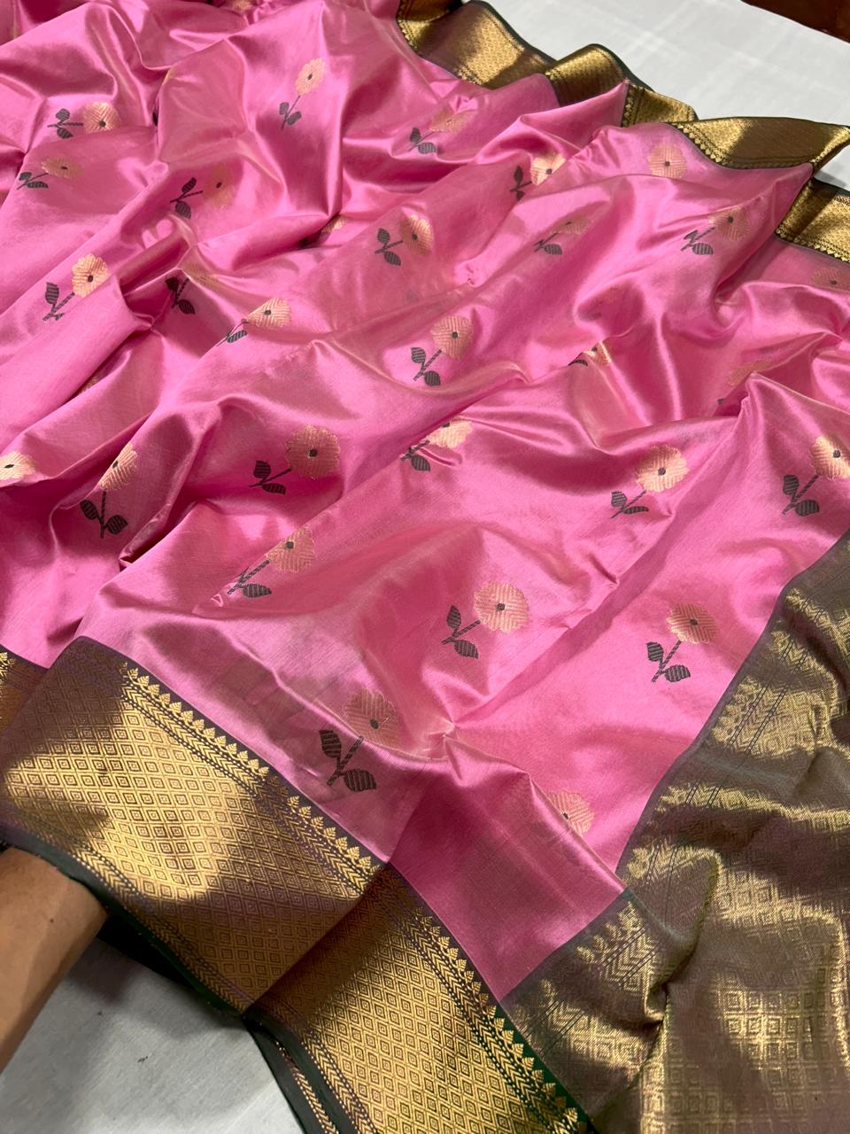 Pink Chanderi Handloom Pattu Silk Nakshi Saree