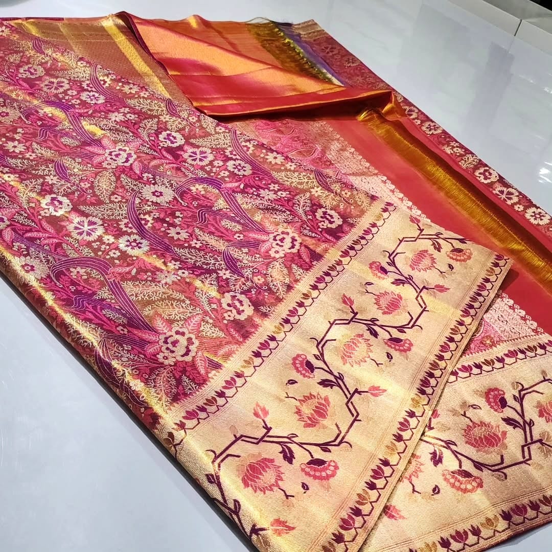 Onion Pink Kanchipuram Handloom Tissue Brocade Meenakari Silk Saree