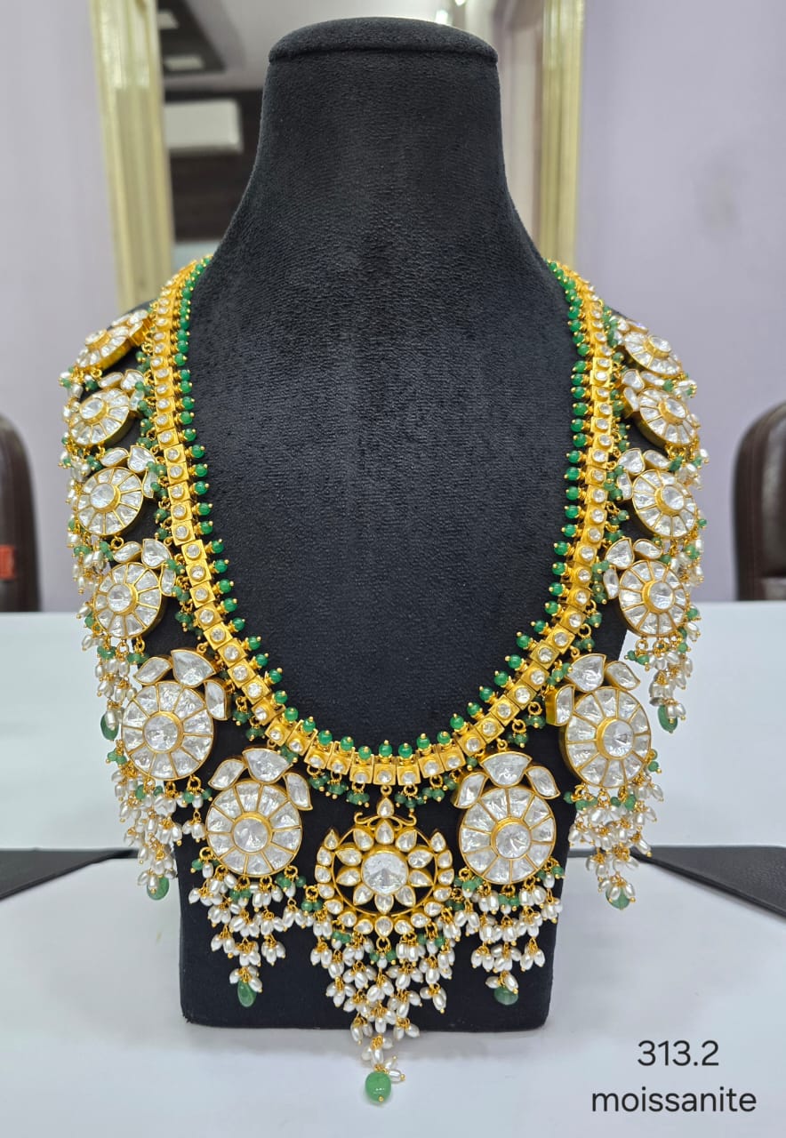 Make a grand entrance with this magnificent Moissanite Floral Statement Haar. This heavy necklace features oversized, circular floral motifs encrusted with high-quality Moissanite Polki stones. The intricate gold-toned craftsmanship is highlighted by a delicate border of vibrant green beads, creating a striking contrast that radiates royal elegance.