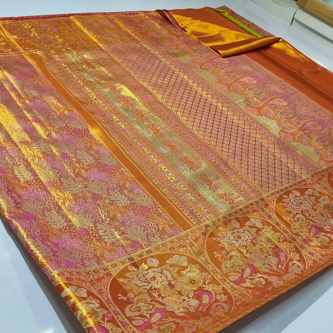 Orange Kanchipuram Handloom Tissue Brocade Meenakari Silk Saree