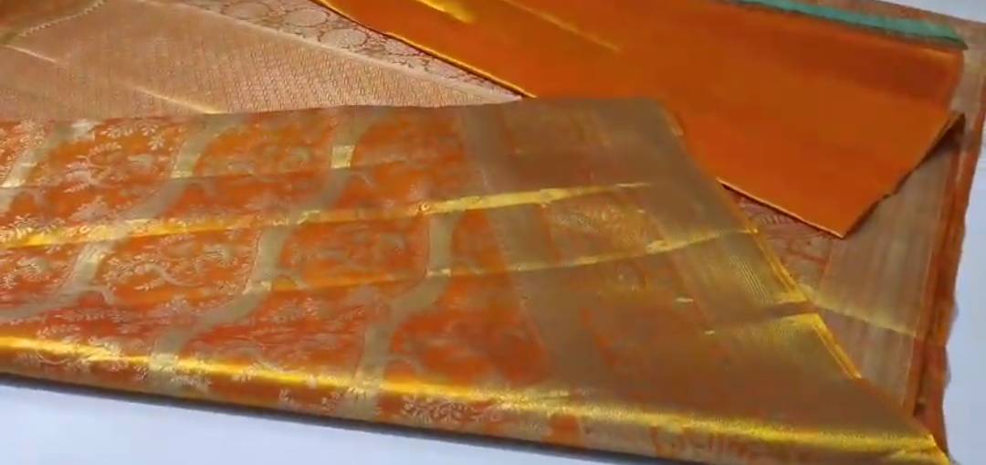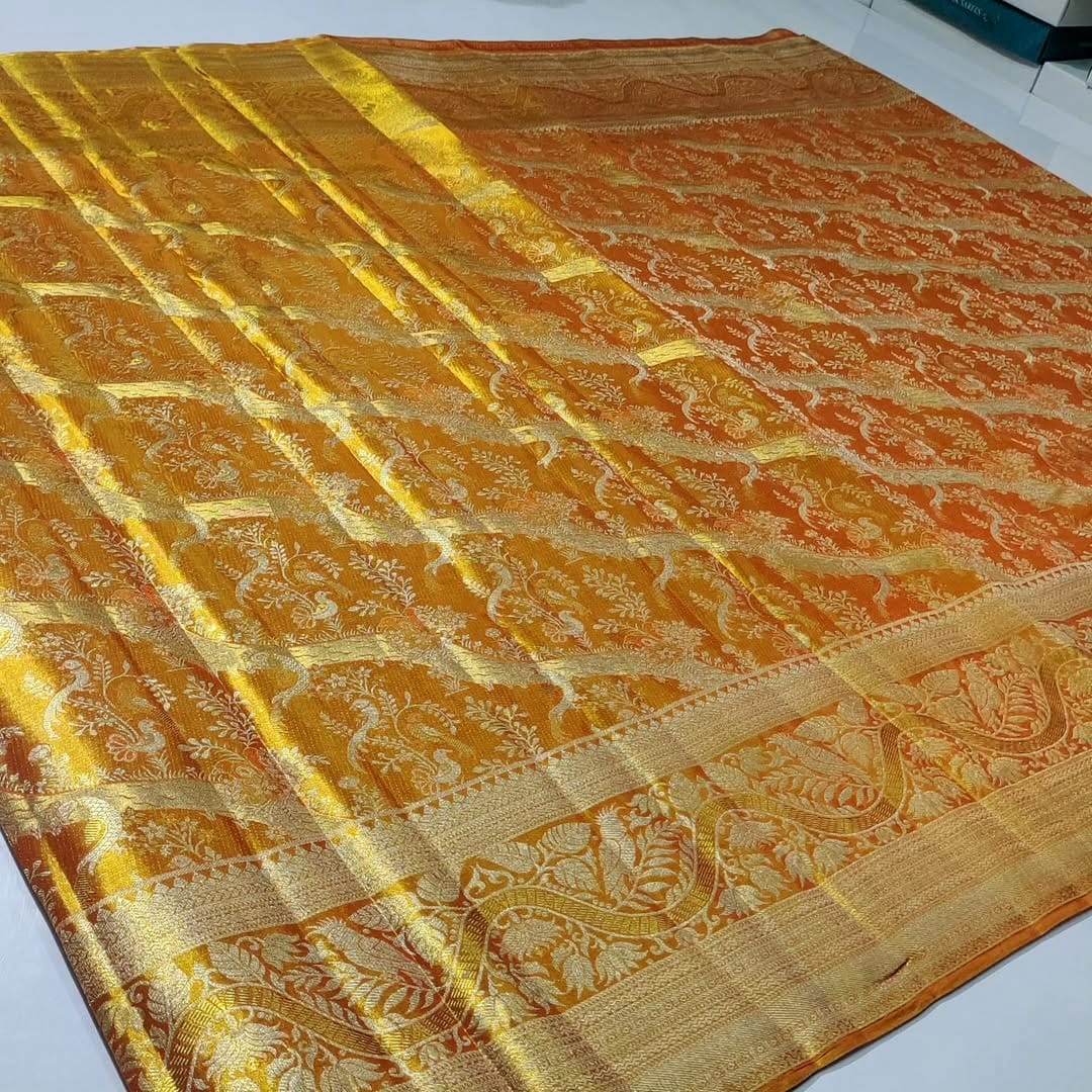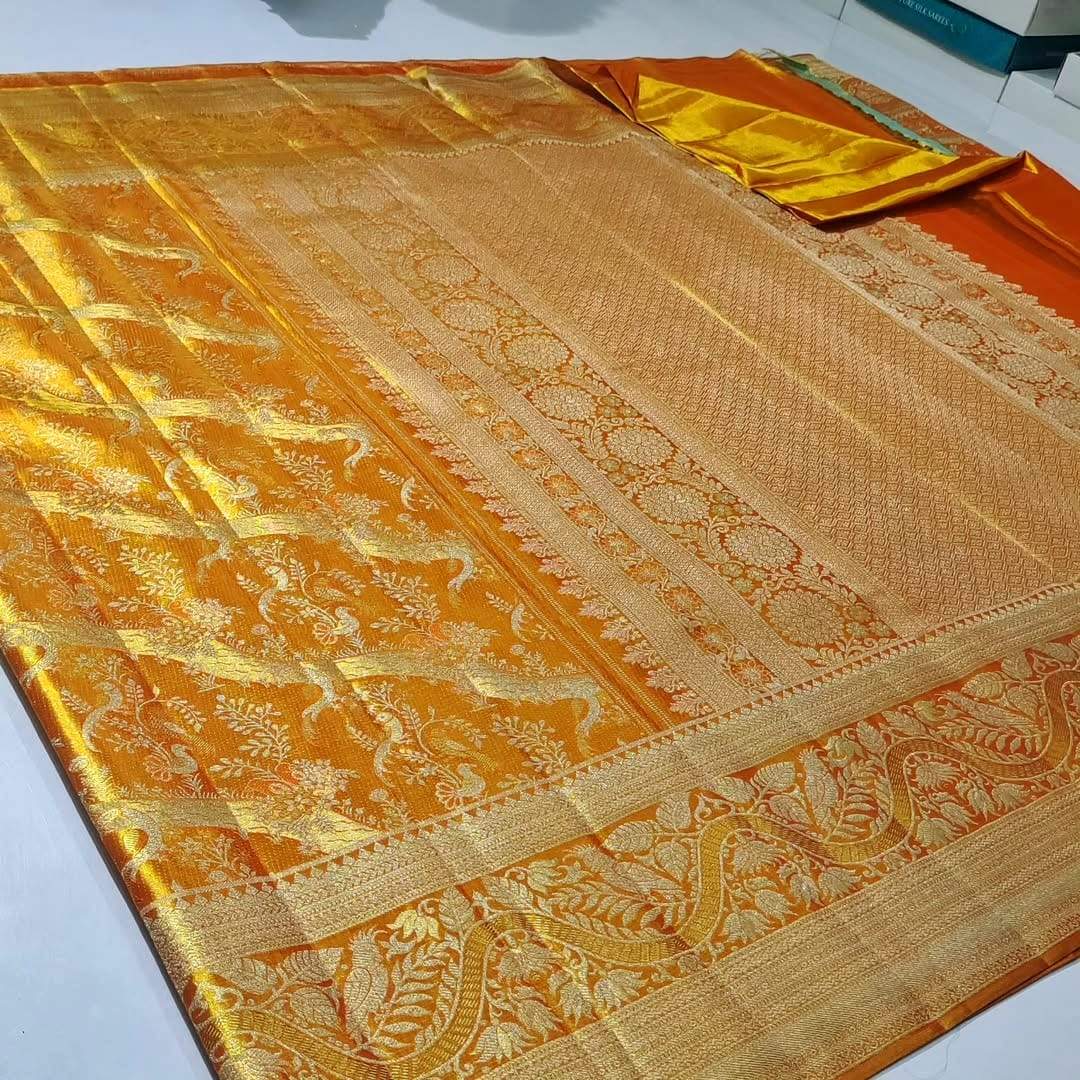 Orange Kanchipuram Handloom Tissue Brocade Silk Meenakari Saree