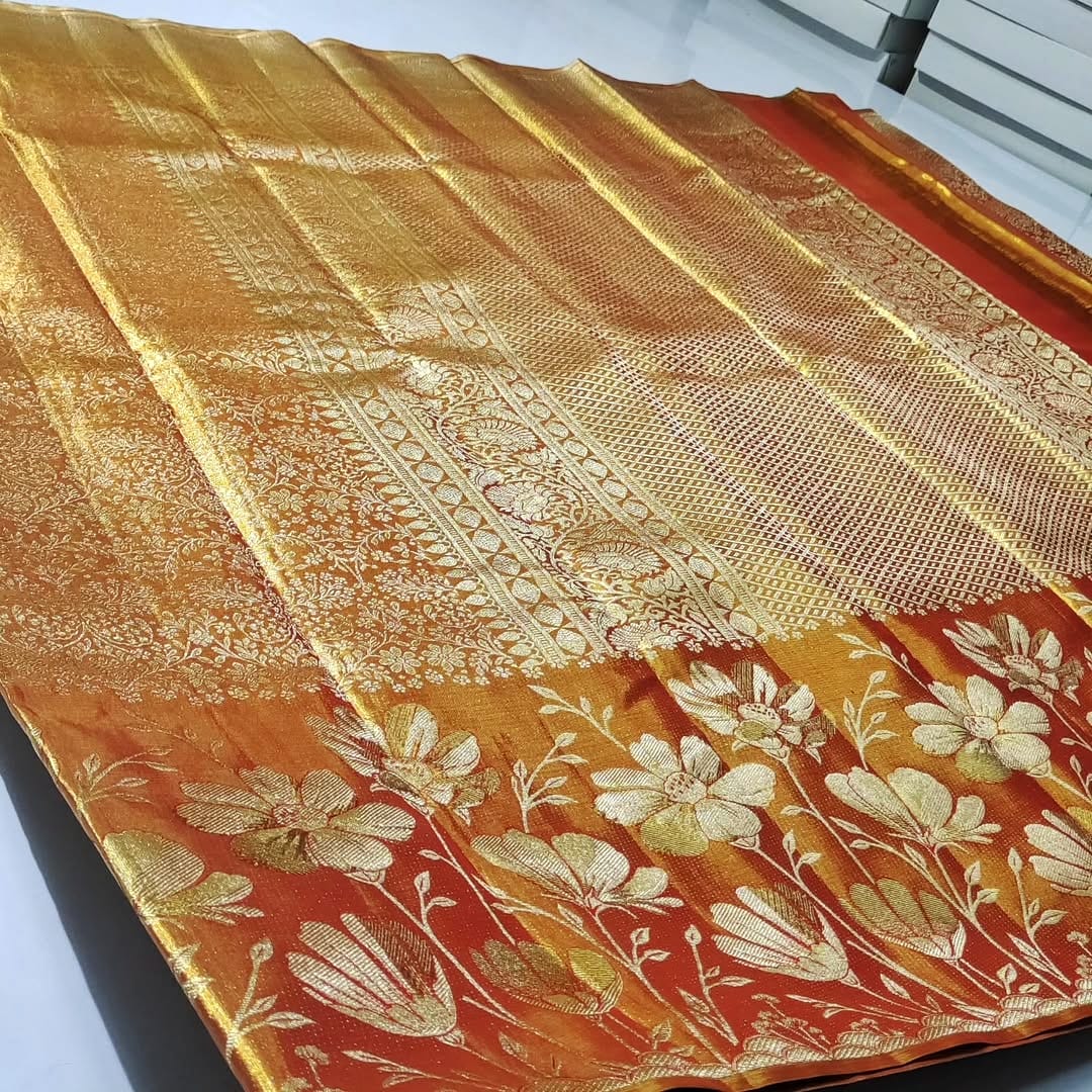 Orange Kanchipuram Handloom Tissue Brocade Silk Saree
