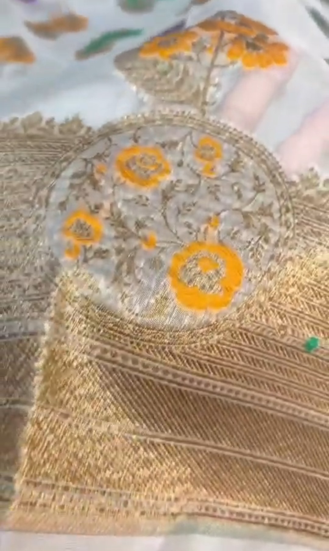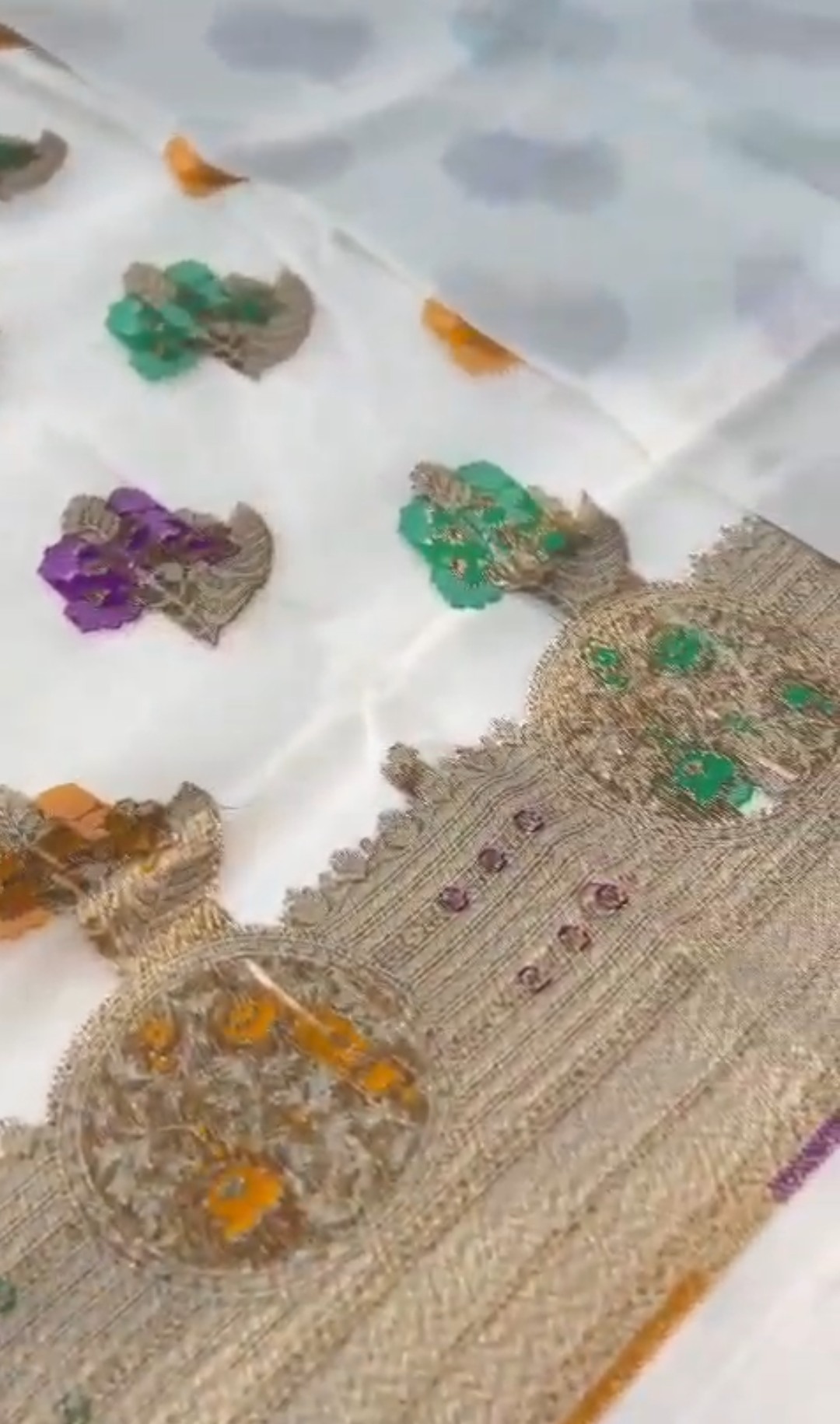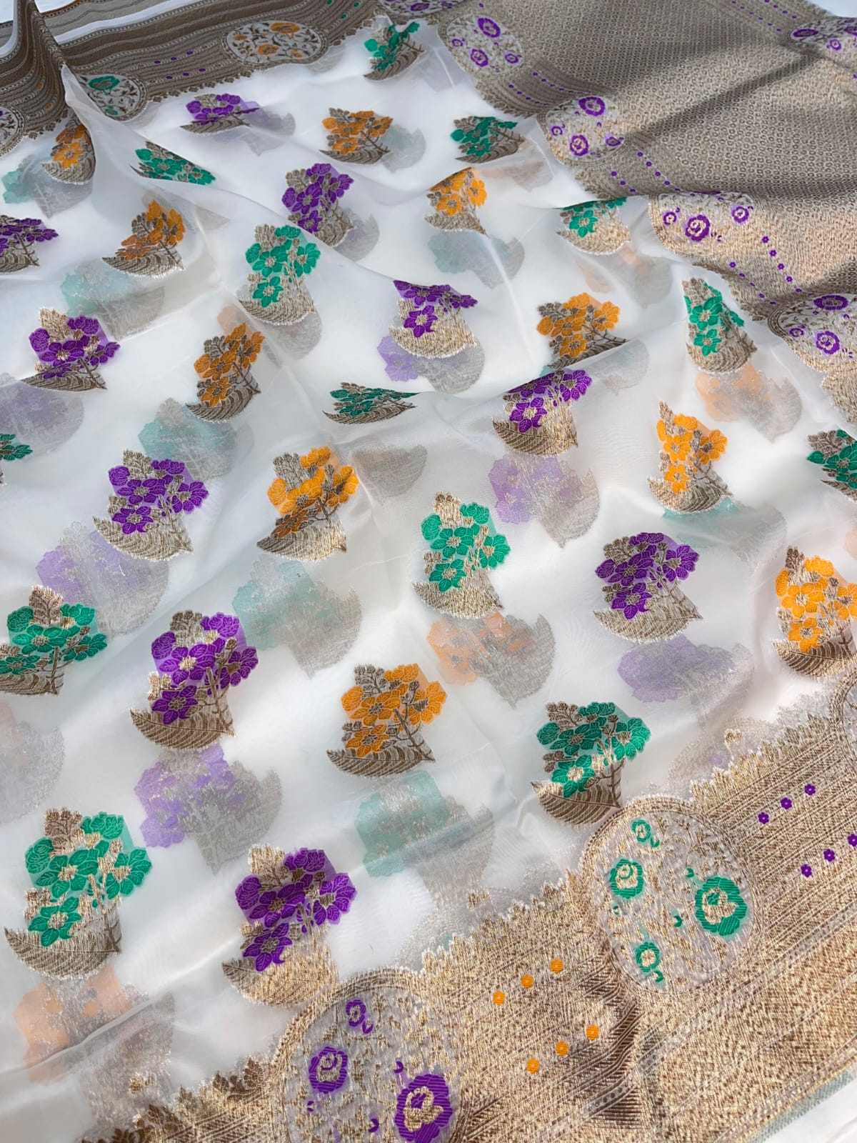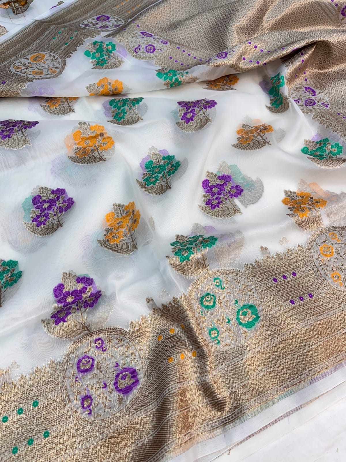 Pearl White Banarasi Handloom Kora Organza Silk Meenakari Saree