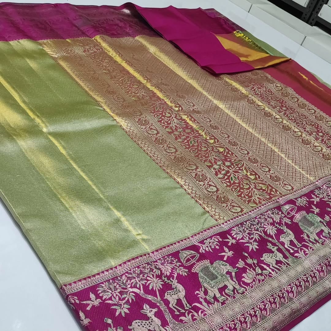 Pista Green Kanchipuram Handloom Tissue Brocade Meenakari Silk Saree