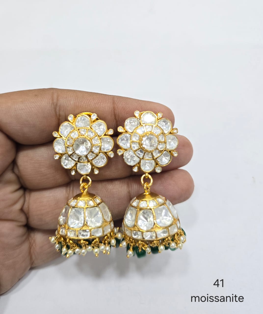 Premium Jadau Moissanite Jhumka Earrings with Floral Studs and Emerald Droplets