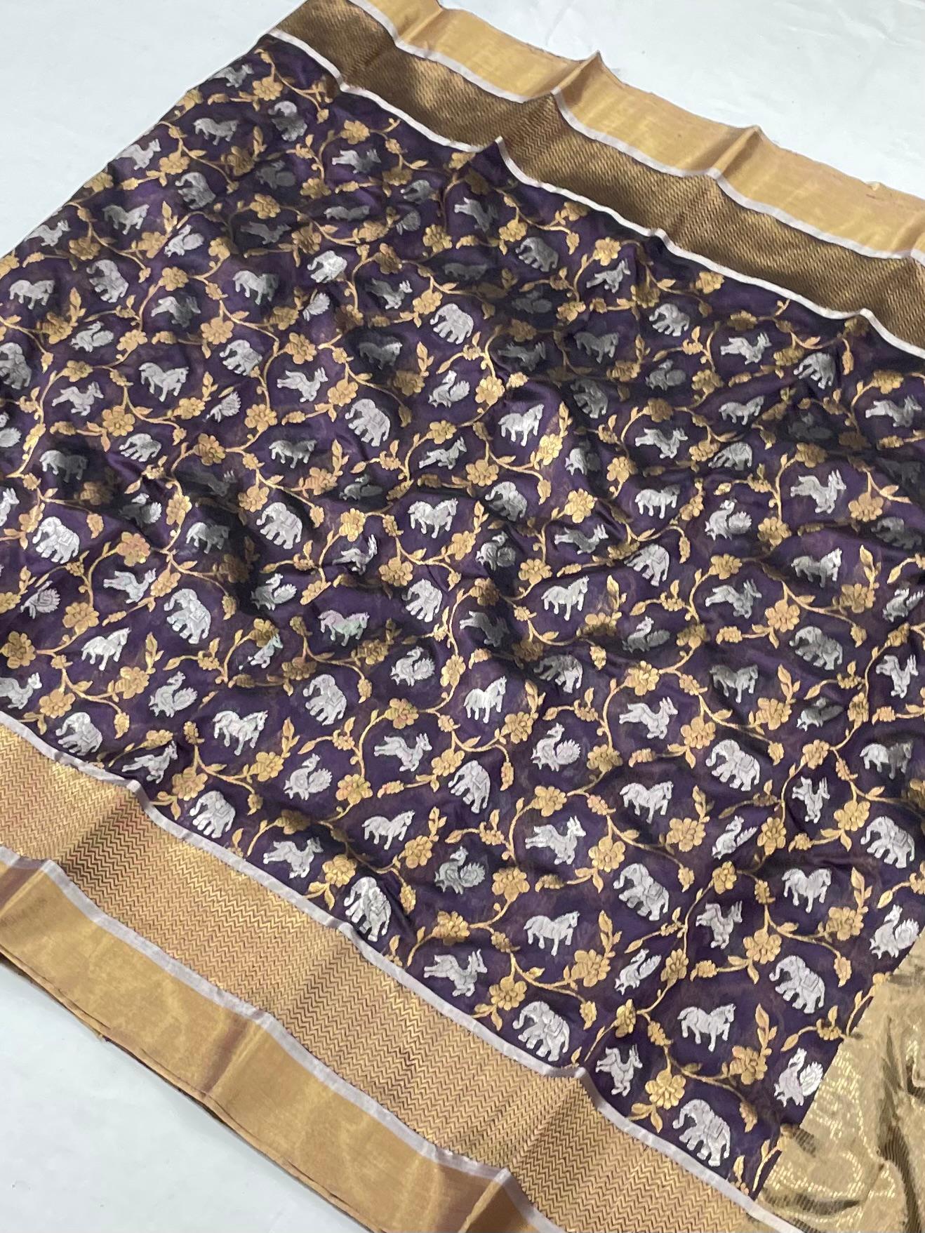 Purple Chanderi Handloom Pattu Silk Shikargah Handwork Saree