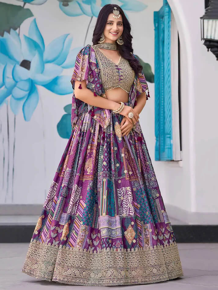 We’re introducing a stylish purple chinnon silk lehenga with multicolored prints with zari and dori embroidery work. The embroidered blouse with a pearl-trimmed scalloped hem pairs with choker style dupatta. Perfect for weddings, parties, and festive celebrations.