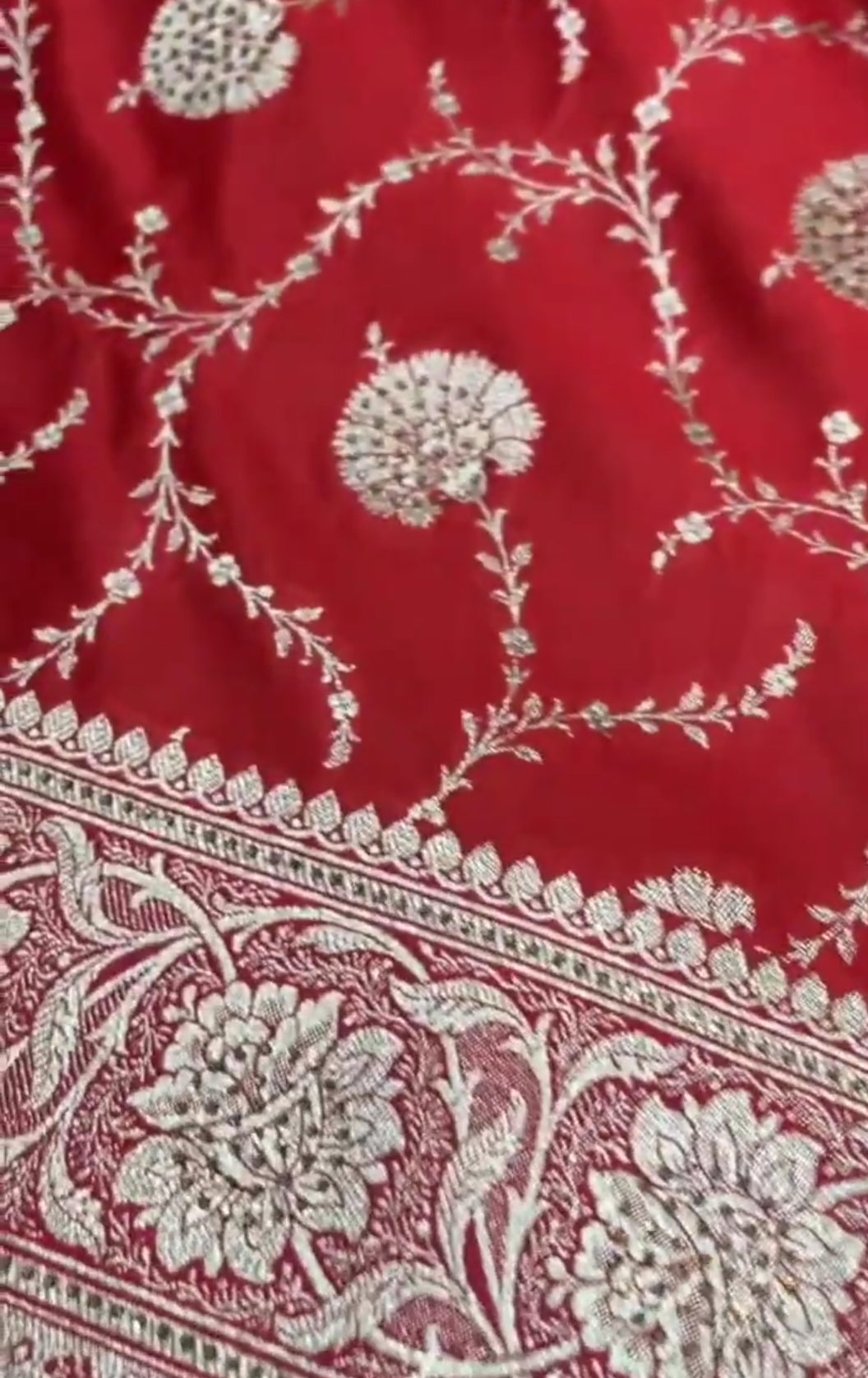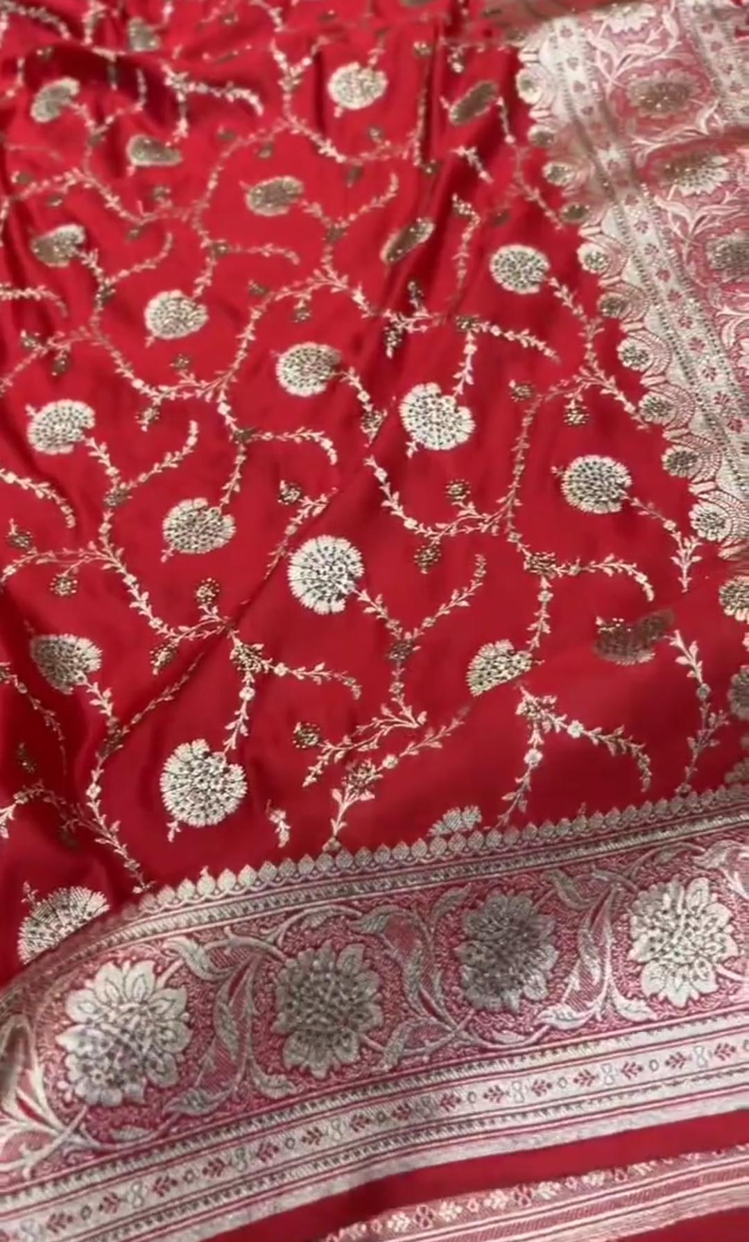 Red Banarasi Satin Katan Silk Swarovski Jangla Saree
