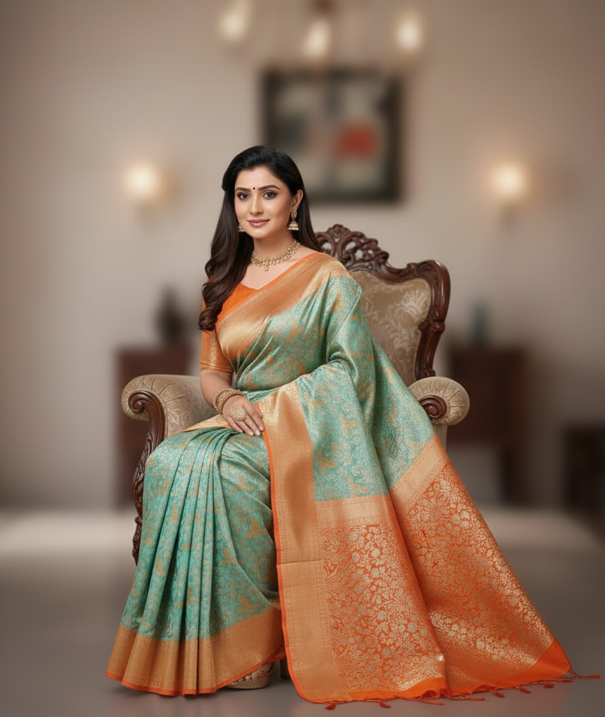 Sea Green Kanchipuram Handloom Tissue Brocade 1G Gold Bridal Saree