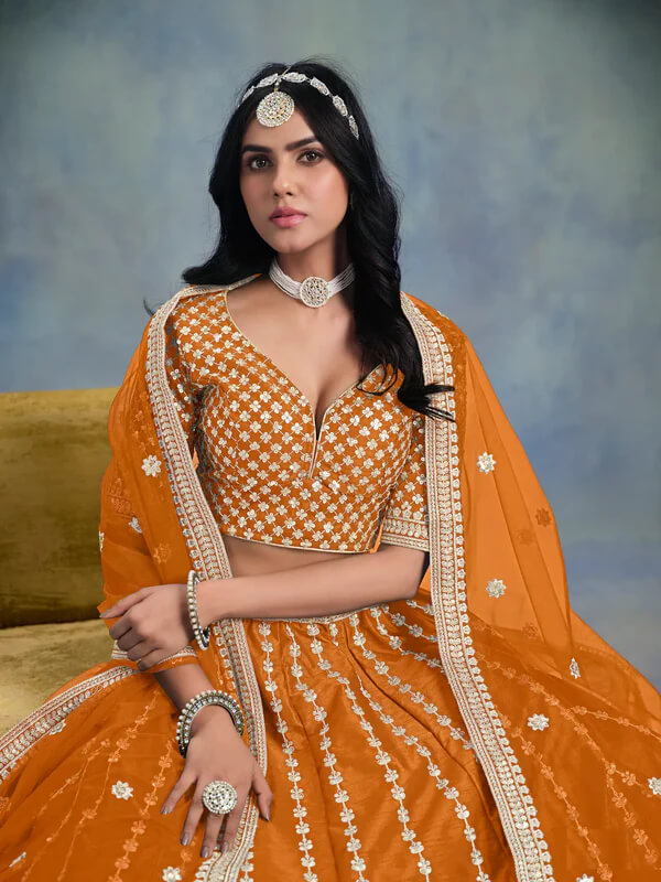 orange art silk lehenga, embroidered orange lehenga choli, designer festive lehenga, wedding orange lehenga, party wear art silk lehenga, sequins thread embroidery lehenga