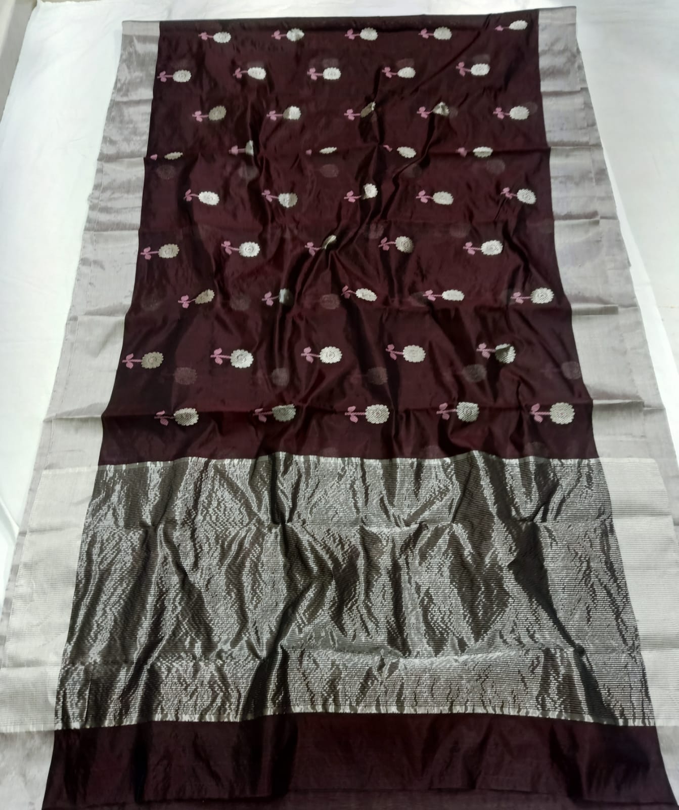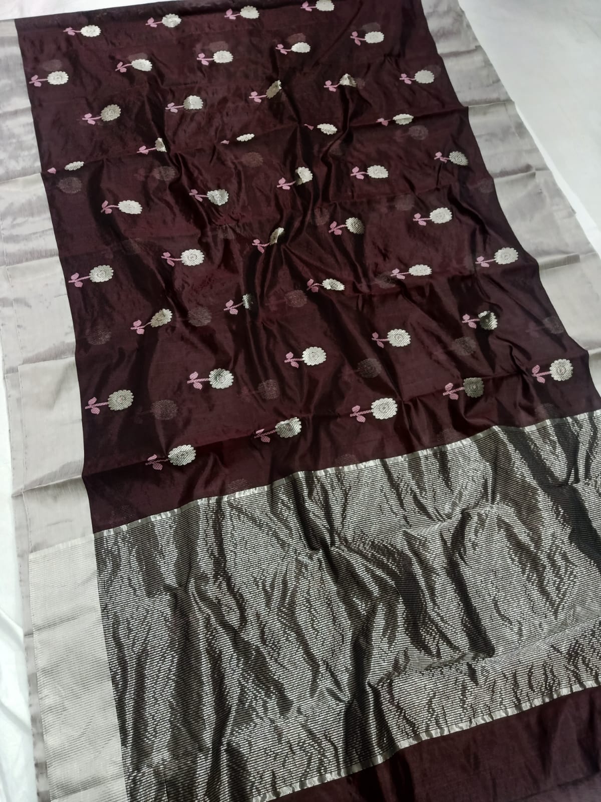 Dark Brown Chanderi Handloom Pattu Silk Eknal Buttas Meenakari Saree