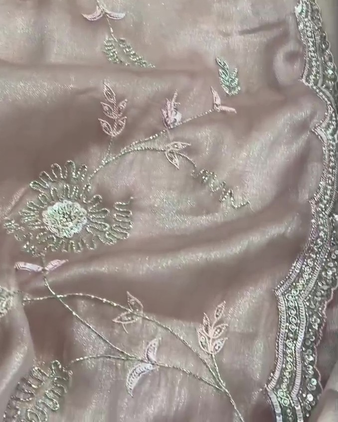 Beige Hand Embroidered Tissue Organza Silk Saree