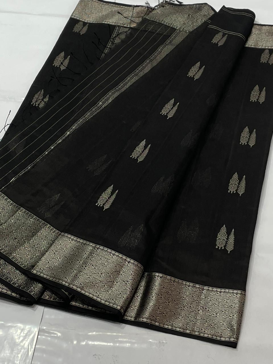 Black Chanderi Handloom Pattu Silk Eknal Buttas Saree