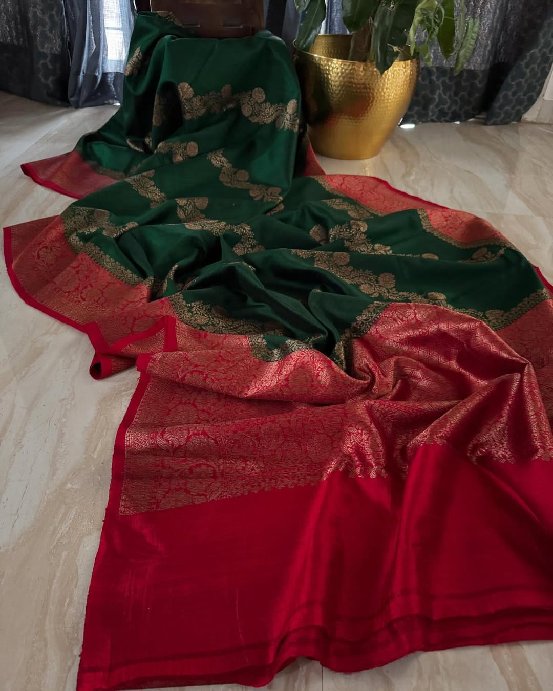 Bottle Green Banarasi Handloom Tussar Raw Silk Saree