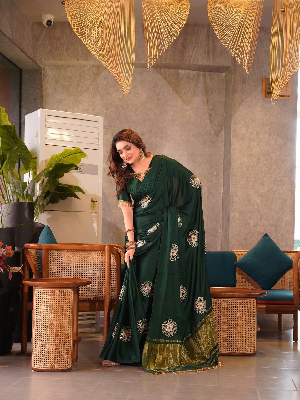 Bottle Green Hand Embroidered Jaipuri Gajji Silk Saree