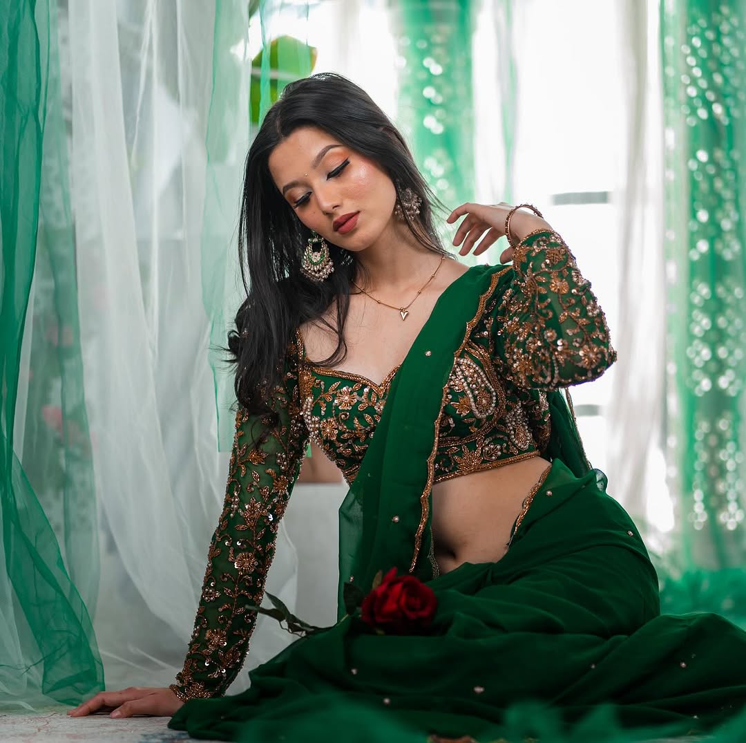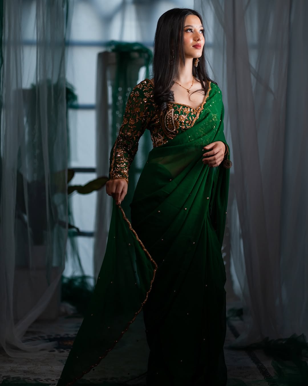 Bottle Green Hand Embroidered Organza Silk Saree