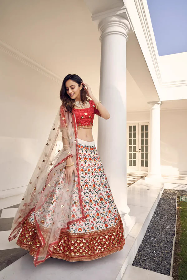 white silk lehenga, art silk lehenga choli, thread embroidery lehenga, sequence work lehenga, white bridal lehenga, elegant white lehenga, festive wear lehenga, designer silk lehenga