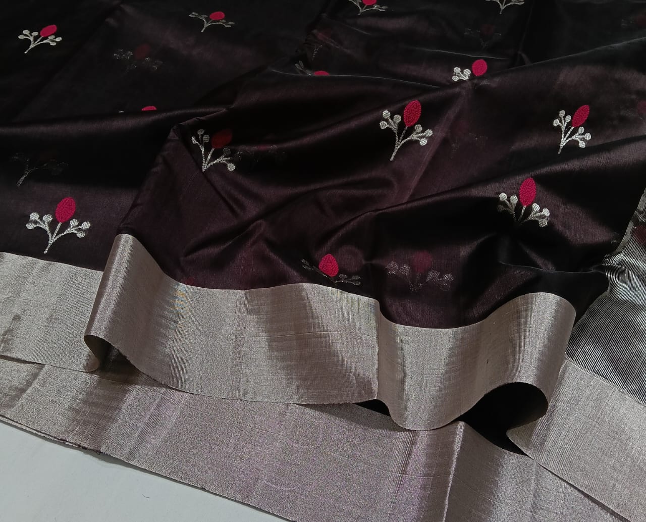 Black Chanderi Handloom Pattu Silk Handwork Saree