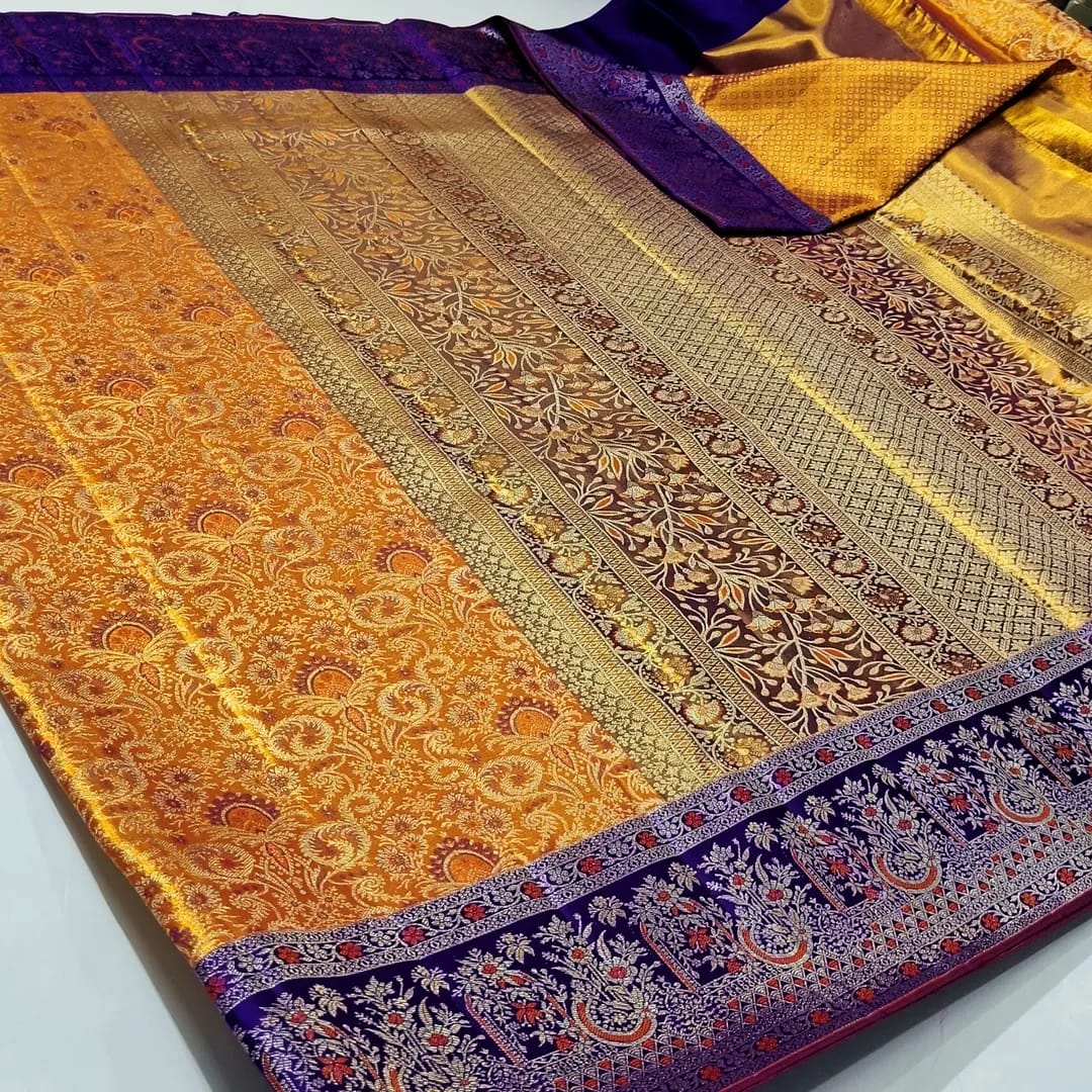 Mustard Kanchipuram Handloom 4D Tissue Brocade Silk Saree