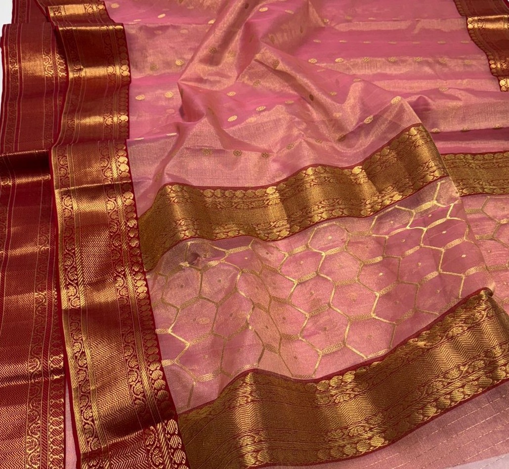 Pastel Peach Chanderi Handloom Katan Tissue Silk Meenakari Saree