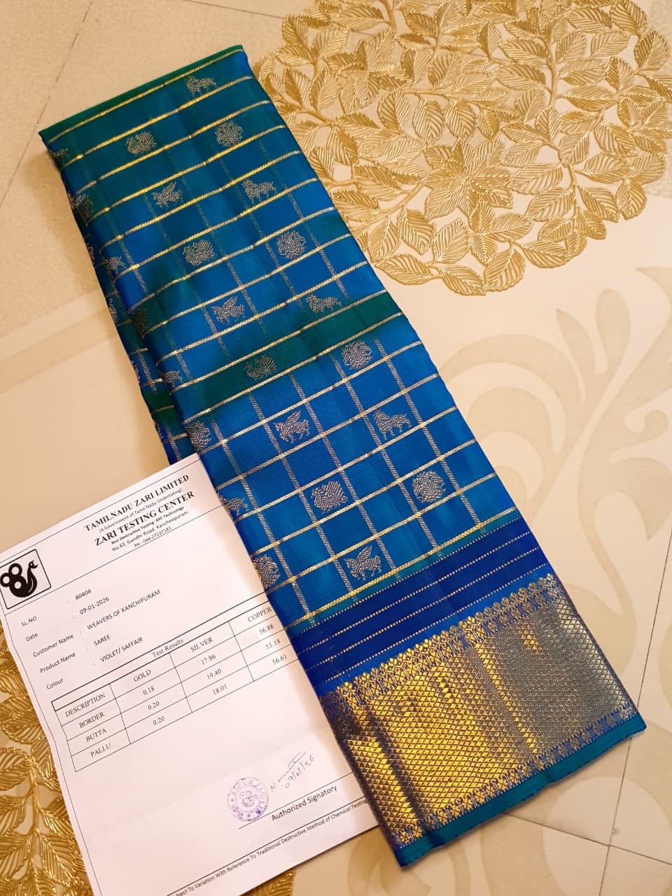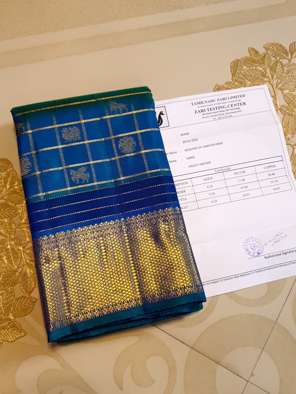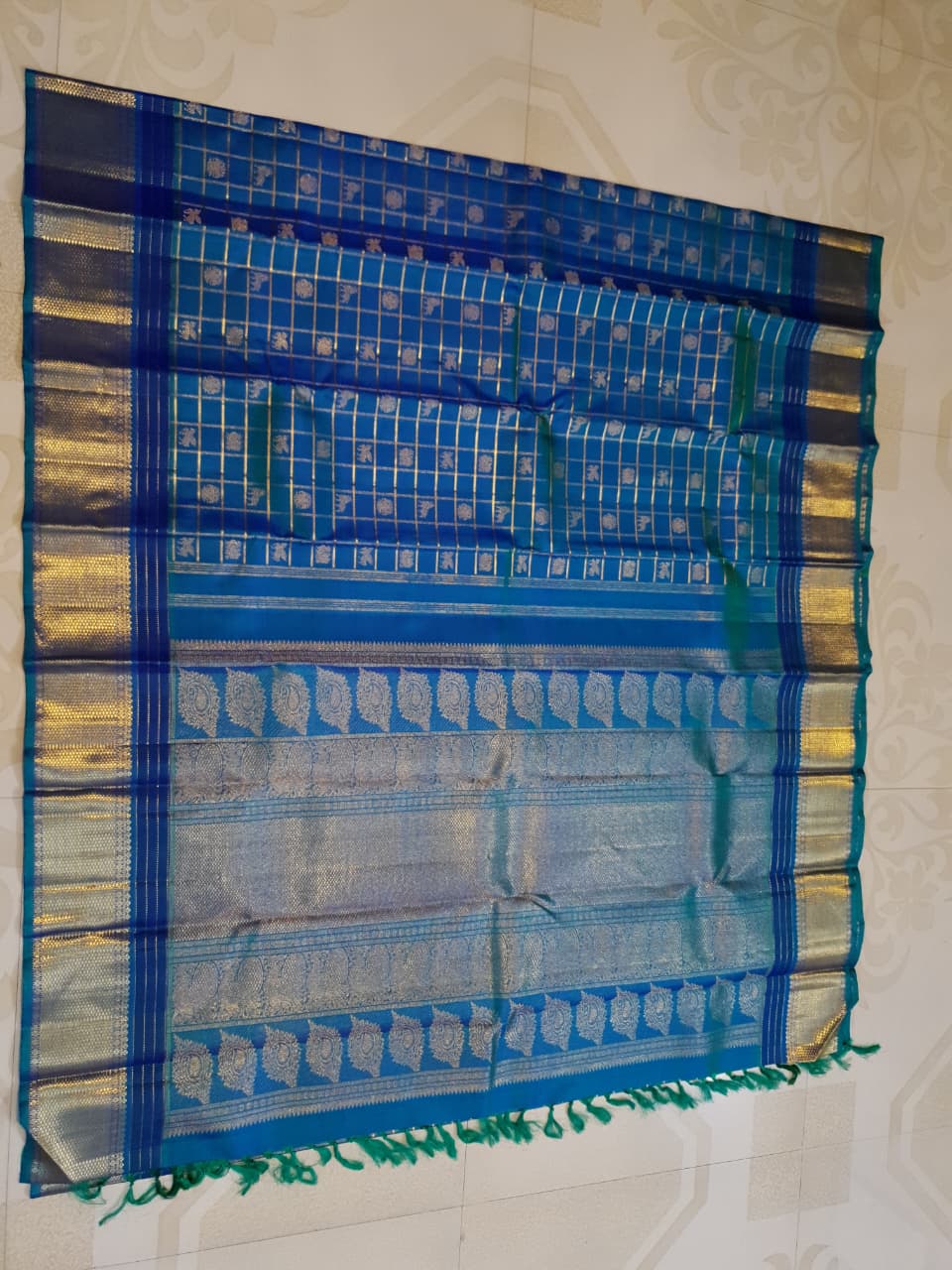 Peacock Blue Kanchipuram Handloom 3G Gold Pattu Silk Saree