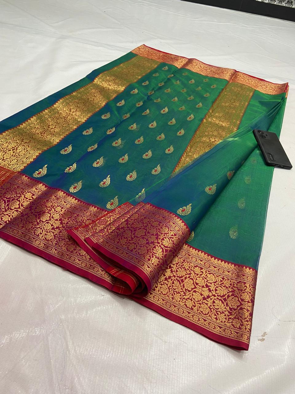 Peacock Green Chanderi Handloom Katan Silk Meenakari Saree