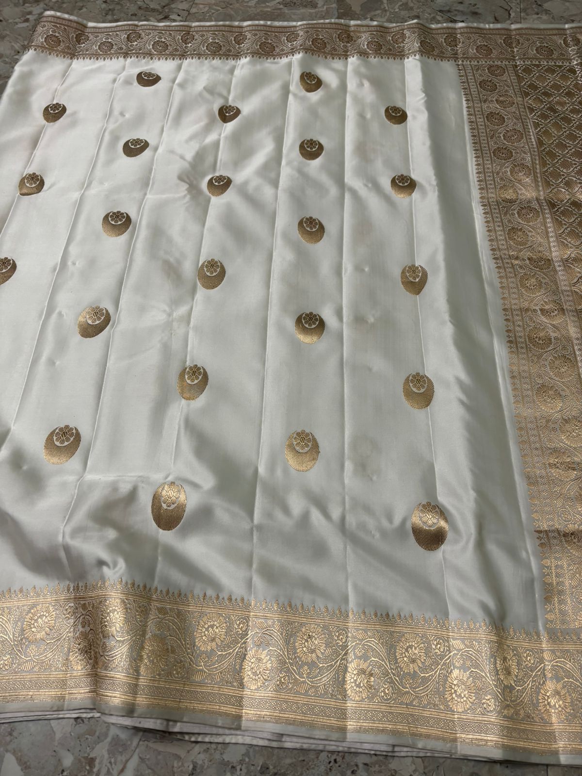 Pearl White Banarasi Handloom Mashru Silk Chand Tara Saree