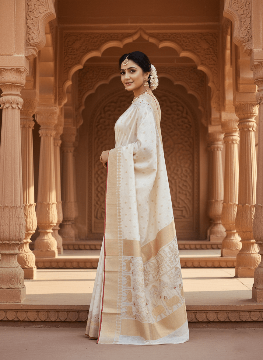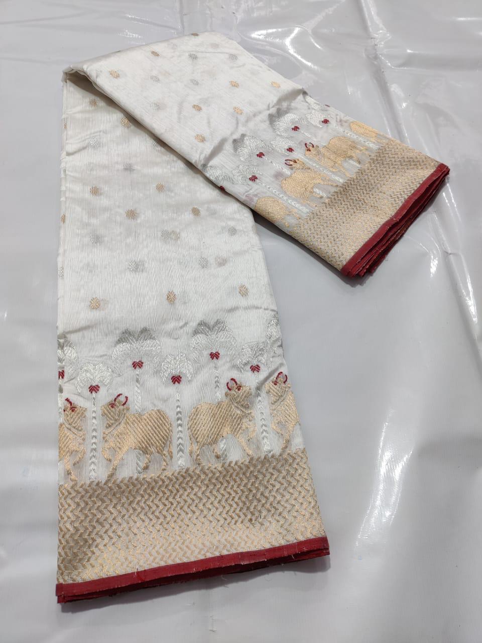Pearl White Chanderi Handloom Pattu Silk Meenakari Saree