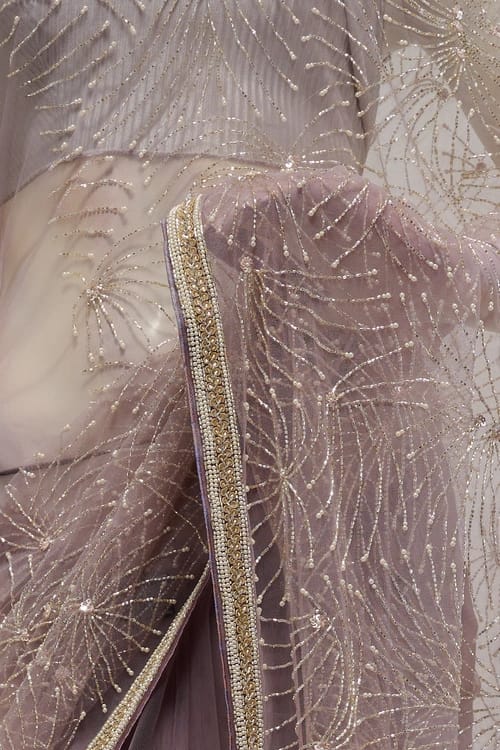 Pinkish Beige Hand Embroidered Soft Net Saree