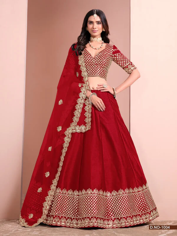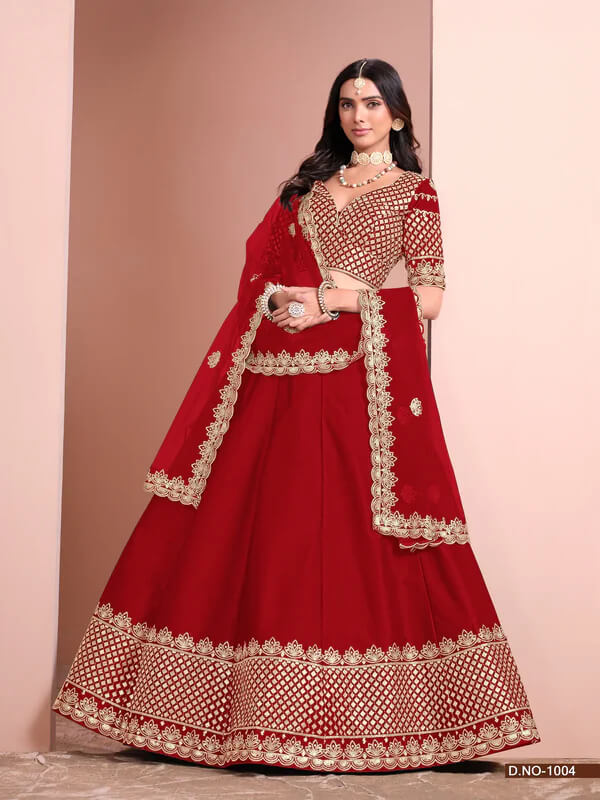 This red lehenga in art silk features paper mirror, thread, & sequins embroidery, paired with a matching blouse and net dupatta, beautifully adorned with embroidery, making it a graceful and elegant.