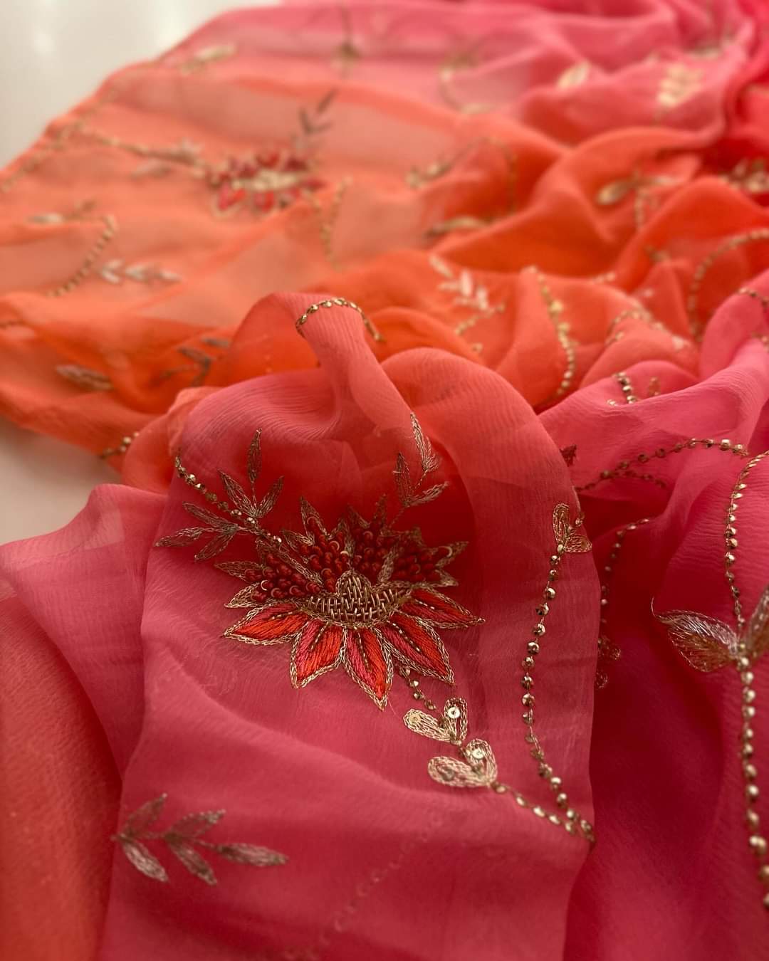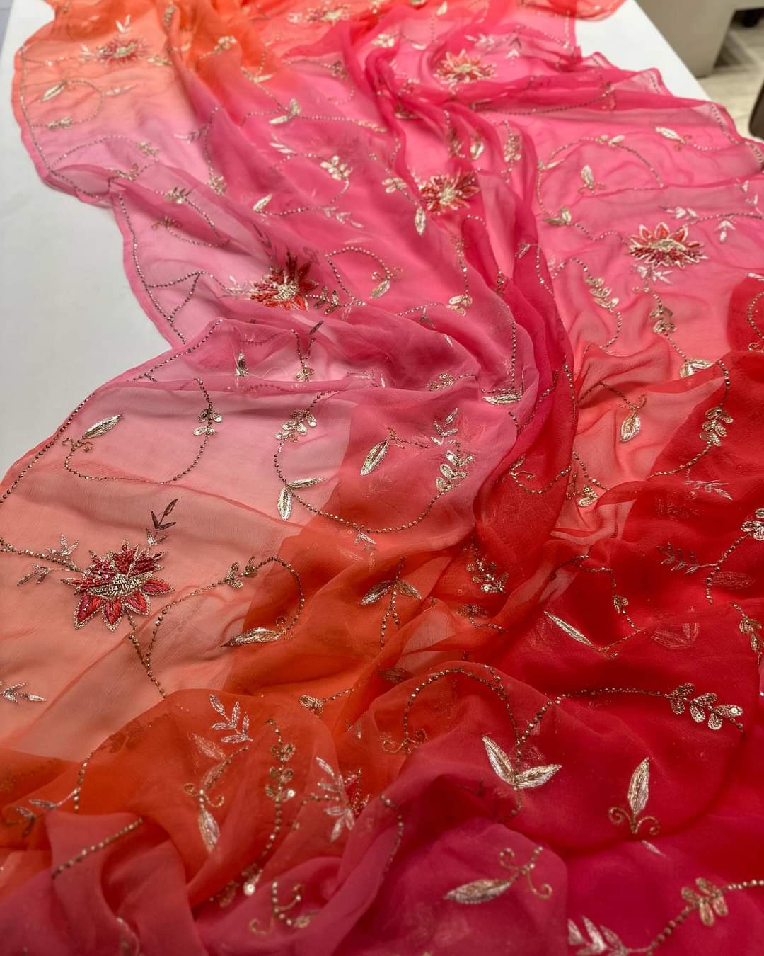 Red Hand Embroidered Diamond Chiffon Silk Saree