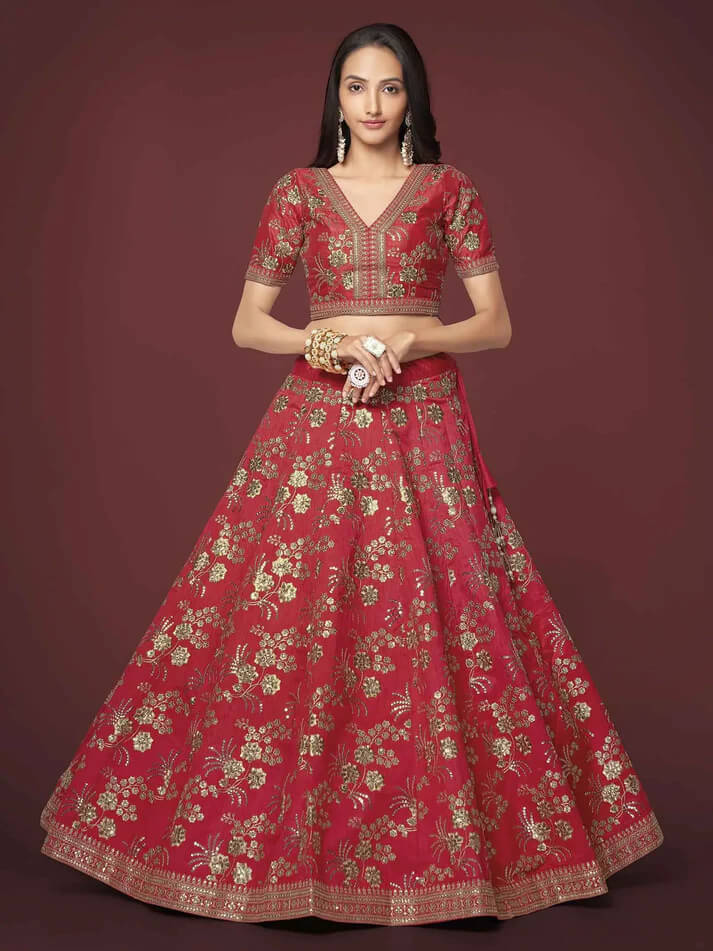 Red Silk Lehenga with Zari, Sequins & Dori Work