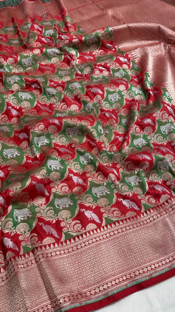Red Banarasi Handloom Katan Silk Shikargah Meenakari Saree