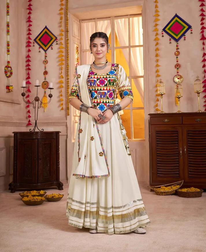 White Kutchi Mirror Kodi Work Navratri Lehenga Choli
